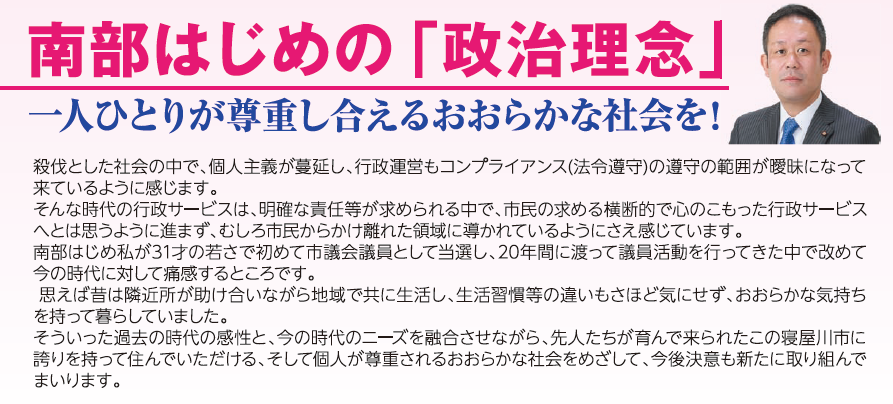 南部はじめは、寝屋川市の『真の課題』である「犯罪を無くし、治安を改善する」ことを最も優先すべき政策として『新・五ツ星☆プロジェクト』をお示ししてまいります!